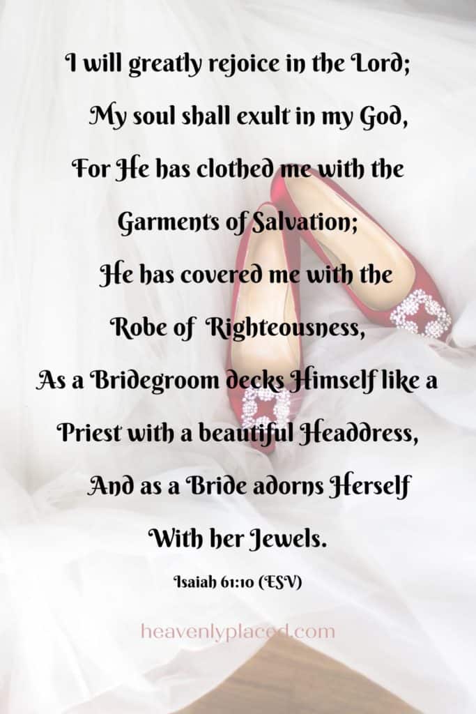 I will greatly rejoice in the Lord; my soul shall exult in my God, for He has clothed me with the garments of salvation; He has covered me with the robe of righteousness as a bridegroom decks himself like a priest with a beautiful headdress, and as a bride adorns herself with her jewels. -Isaiah 61:10